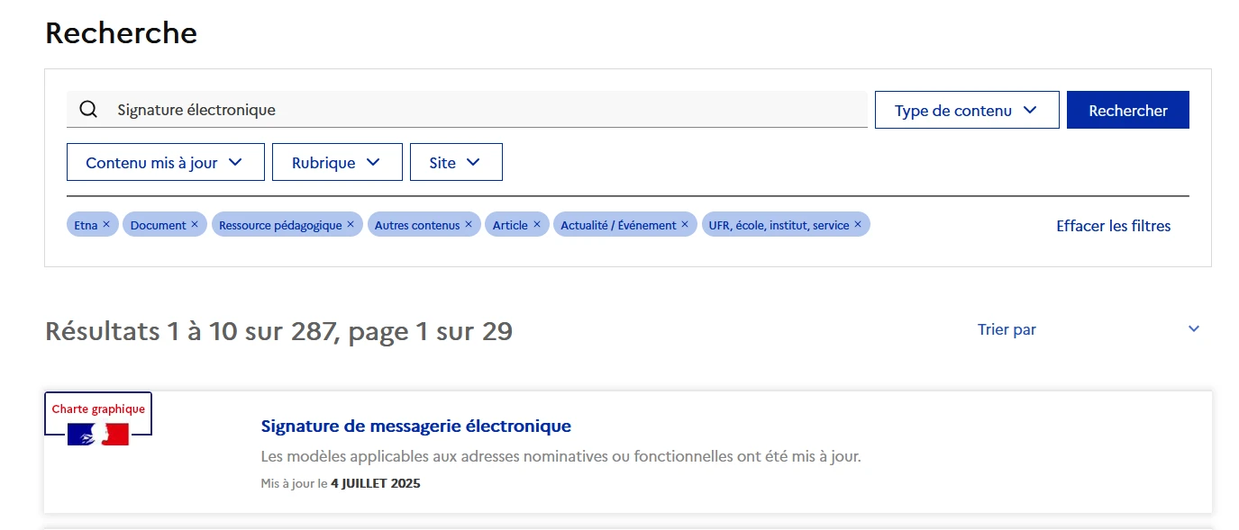 Le nouveau moteur de recherche fonctionne désormais par mots-clés. Afin de le rendre le plus performant et pertinent possible, un travail d’indexation et de référencement des contenus existants est en cours et se poursuivra jusqu’à l’automne 2025. Le moteur de recherche dispose de différents filtres de tri qui permettent de préciser votre demande par type de contenu (actualité, document etc.)