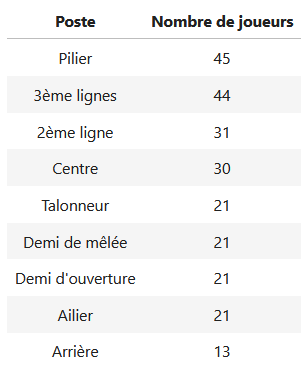 Cet algorithme nécessite un jeu de données, le plus large possible. Nous utiliserons les données mises à disposition par l'organisation "Six Nations Rugby Limited". Ces données concernent les équipes des hommes sur la saison 2020-2021, et sont compilées dans le fichier "Joueurs_rugby_6_nations.csv".