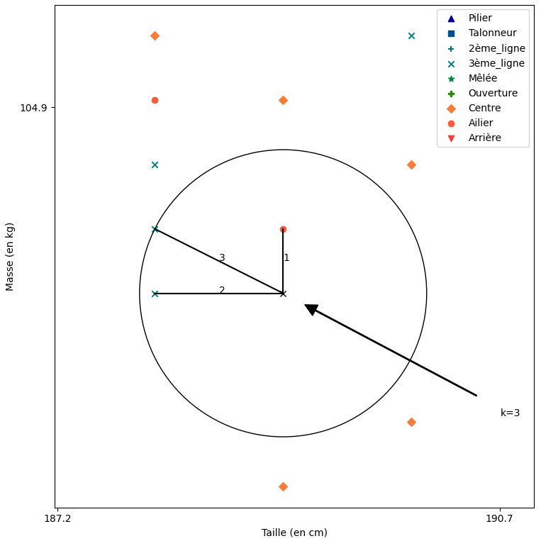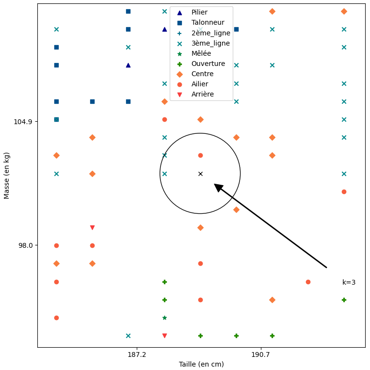 On pourrait maintenant en déduire que Caliméro a la stature d'un centre ? Tous ses voisins ! Inutile de consulter le graphique dans ce cas, il suffit de trouver quel poste est le plus présent dans la base de donnée et on pourrait alors en déduire que Caliméro sera parfaitement à sa place au poste de... Pilier !?