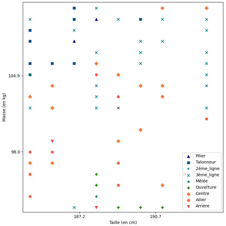 Nous allons voir comment l'algorithme des kPPV peut nous aider à prévoir quel poste pourrait être proposé à un nouveau joueur de rugby, uniquement d'après sa stature (masse et taille).