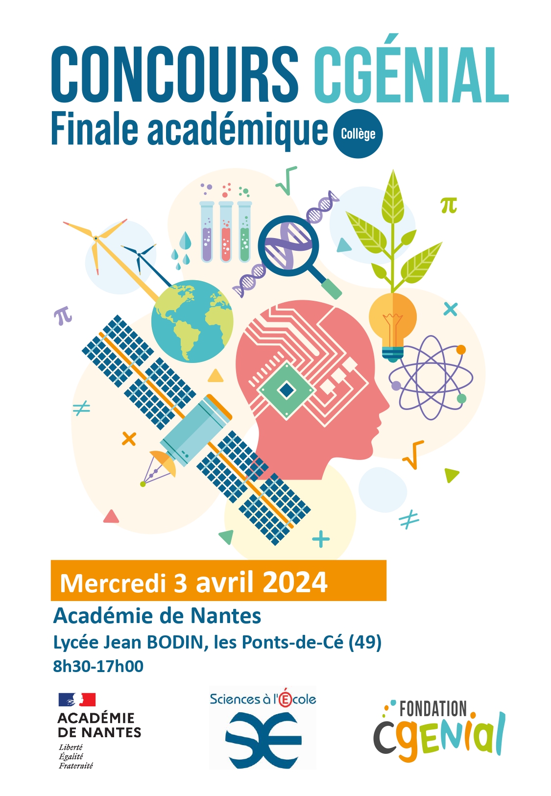 Piloté par sciences à l'école et la Fondation CGénial, le concours CGénial se décline en deux versions : « CGénial-lycée », coordonné au niveau national et « CGénial-collège », porté par chaque académie, qui organise sa propre finale pour sélectionner le projet qui participe à la finale nationale. Pour l’Académie de Nantes, M. Patrice MICHEL est référent pour le concours CGénial-collège. A ce titre, il peut renseigner et accompagner les professeurs qui le souhaitent dans la conduite de leur projet. Patrice.michel@ac-nantes.fr