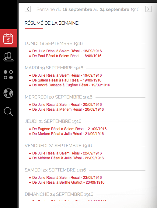 L'interactivité permet de parcourir l'agenda visuel de la Grande Guerre telle qu'elle fut vécue par la famille Résal mais aussi de découvrir d'autres aspects de la période en correspondance avec leurs activités.