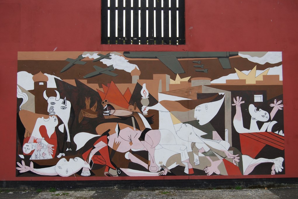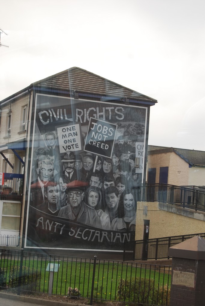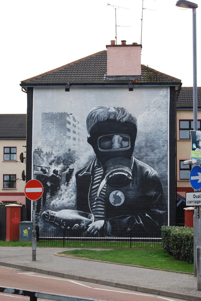 La ville de Derry (Londonderry pour les unionistes) est une ville d'un peu moins de 100 000 habitants. Pendant les années 60 et 70 Derry a été agitée par d'importantes manifestations et révoltes pour l'égalité des droits entre protestants et catholiques. L'évènement le plus marquant a été le bloody sunday le 30 Janvier 1972, quand l'armée britannique a vigoureusement réprimé une manifestation dans le quartier catholique du Bogside. Le bilan fut de 14 morts. Ce quartier commémore l'évènement par ses murals et par le free Derry museum. Les photos 1 et 2 évoquent les manifestations pour l'égalité des droits civiques. La photo 3 est une reproduction de Guernica sur le mur du free Derry Museum où patrimoine artistique universel est invoqué pour la défense de la cause Irlandaise.