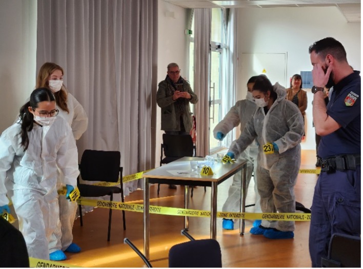 A cette occasion, les Techniciens d’identification Criminelle (TIC) ont initié les élèves de l’option défense une double scène d’enquête, isolée par de la rubalise, pour trouver le responsable de l’enlèvement de Gribouille, un chien d’une grande beauté ! Chacun avait un rôle différent pour apprendre en s’amusant, tout en restant rigoureux dans sa démarche : directeur d’enquête, TIC, manipulateur, photographe, rapporteur : tous ont travaillé ensemble pour figer la scène par des photos, puis relever et analyser des traces de sang sur le sol ou des empreintes digitales sur des verres abandonnés, avant d’émettre des hypothèses et de rapporter leurs conclusions. Un bon moyen de mobiliser ses connaissances et démarches scientifiques !