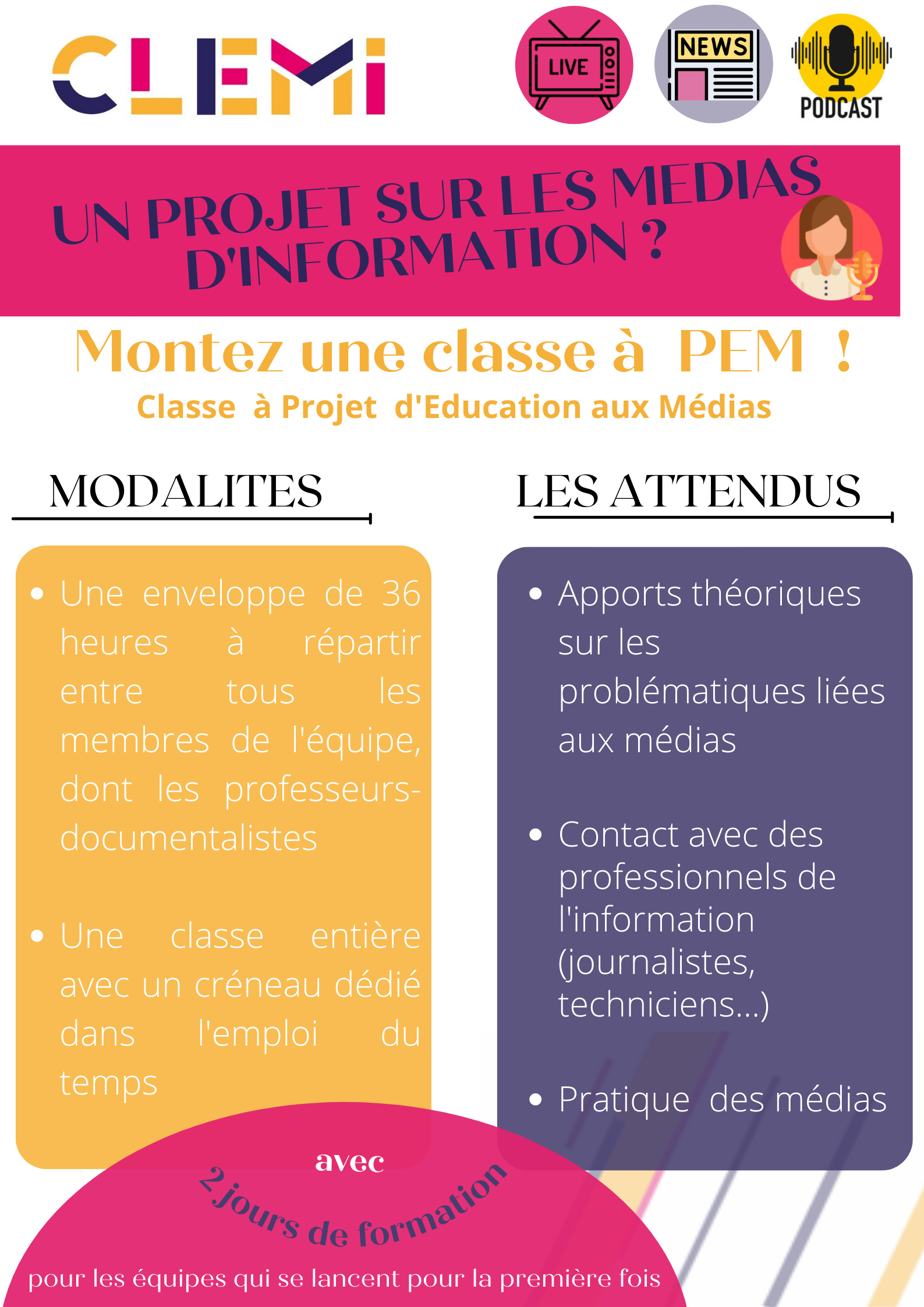 Des exemples de classes à PEM… … au collège Olivier Messiaen à Mortagne sur Sèvre Depuis 5 ans, trois professeurs (français, histoire géographie et documentation) du collège Olivier Messiaen de Mortagne sur Sèvre animent une classe de 4e à Projet d’éducation aux médias. Tout au long de l’année, les élèves participent à des séances d’une durée de 1 à 3 heures autour de la presse les conduisant à s’ouvrir au monde et à gagner en autonomie : revues de presse, écritures d’articles pour le blog d’E-lyco, réalisations de reportages photos, (concours Médiatiks en 2020), rencontres de journalistes, prises de vue et montage vidéo… Depuis janvier 2021, l’acquisition d’une Webradio a permis aux élèves d’enregistrer leurs premiers Podcasts ! La rubrique des articles de la classe à PEM sur la page publique du site Les archives des articles de la classe à PEM sur la page publique (colonne en bas à droite de la page d’accueil sous le logo) Les archives des Podcasts Lien vers un Powtoon réalisé en janvier 2021 par nos élèves de la classe à PEM (objectif : présenter la classe PEM pour intégrer à nos Portes ouvertes virtuelle) … au Lycée Henri Bergson à Angers La classe de 1re G du lycée Henri Bergson participe au dispositif PEM (Projet d’éducation aux médias) depuis la rentrée 2020. La thématique retenue est "Une année littéraire et médiatique". Le projet s’articule autour des œuvres au programme du baccalauréat de Français. Les élèves s’approprient les enjeux littéraires de ces œuvres en produisant des supports médiatiques variés (magazine, chronique judiciaire, photo-reportage…) et se familiarisent ainsi avec le monde des médias et ses codes d’écriture et de communication.