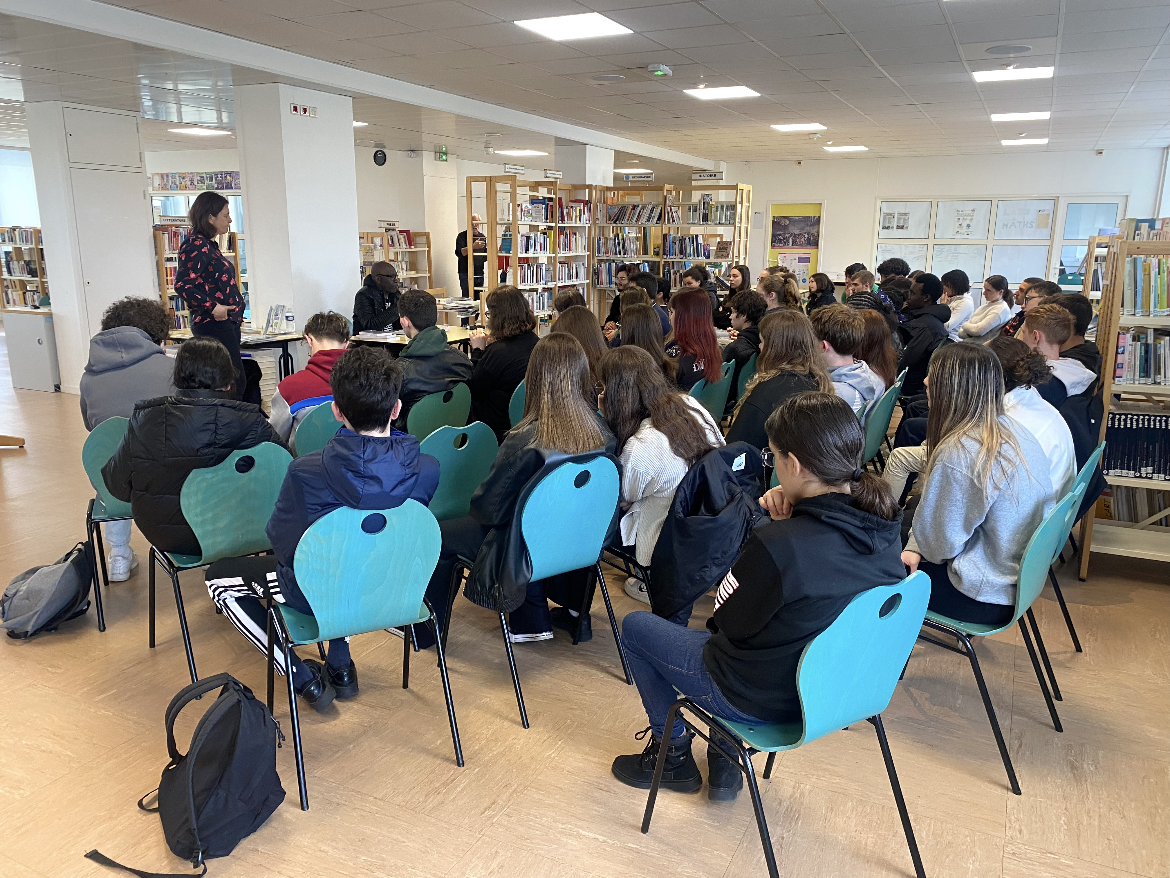 En habitué de l’opération Renvoyé Spécial organisée conjointement par le Clémi et par la Maison des Journalistes, Ghys Fortuné Bemba Dombé n’a pas hésité à dire oui lorsque je l’ai sollicité pour répondre à une demande de l’équipe pédagogique du lycée Rosa Parks, à La Roche-sur-Yon (Vendée). Car si leur candidature n’avait pas été retenue par le jury national, les enseignantes Mmes Maric-Patrow et Bonnet souhaitaient tout de même trouver une solution pour leurs élèves. Et c’est ainsi que la classe de seconde bac professionnel menuiserie a été rejointe au CDI par les élèves de 1re de la spécialité Histoire géographie sciences politiques (HGSP) mardi 16 avril 2024, pour une matinée de rencontre en tête à tête avec le journaliste congolais exilé.