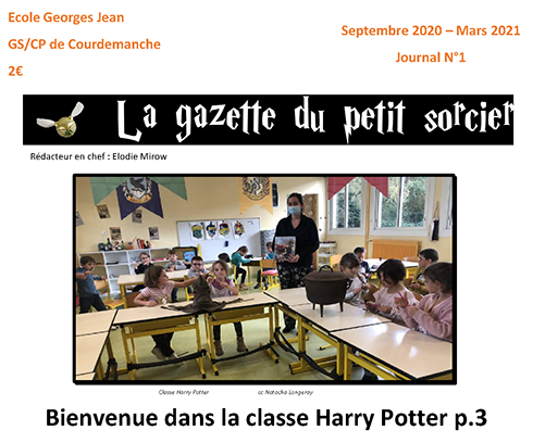 Pour cette occasion le premier numéro de leur journal scolaire "La Gazette du petit sorcier" a été offert aux invités. Cette classe flexible placée sous le signe d'Harry Potter, a réalisé de nombreux articles en lien avec leur vie de classe et le métier de journaliste, avec une interview d'une journaliste du Maine Libre. Lors de la séance proposée, chaque petit groupe d'élève a découvert un article sélectionné par l'enseignante qui étaient à la Une, ils ont ensuite présenté leur article à la classe. Enfin, par binôme ils ont choisi un des 3 articles pour créer à leur tour leur Une. Cette séance a été l'occasion de montrer qu'ils connaissaient bien le vocabulaire spécifique à la fabrication d'un journal.