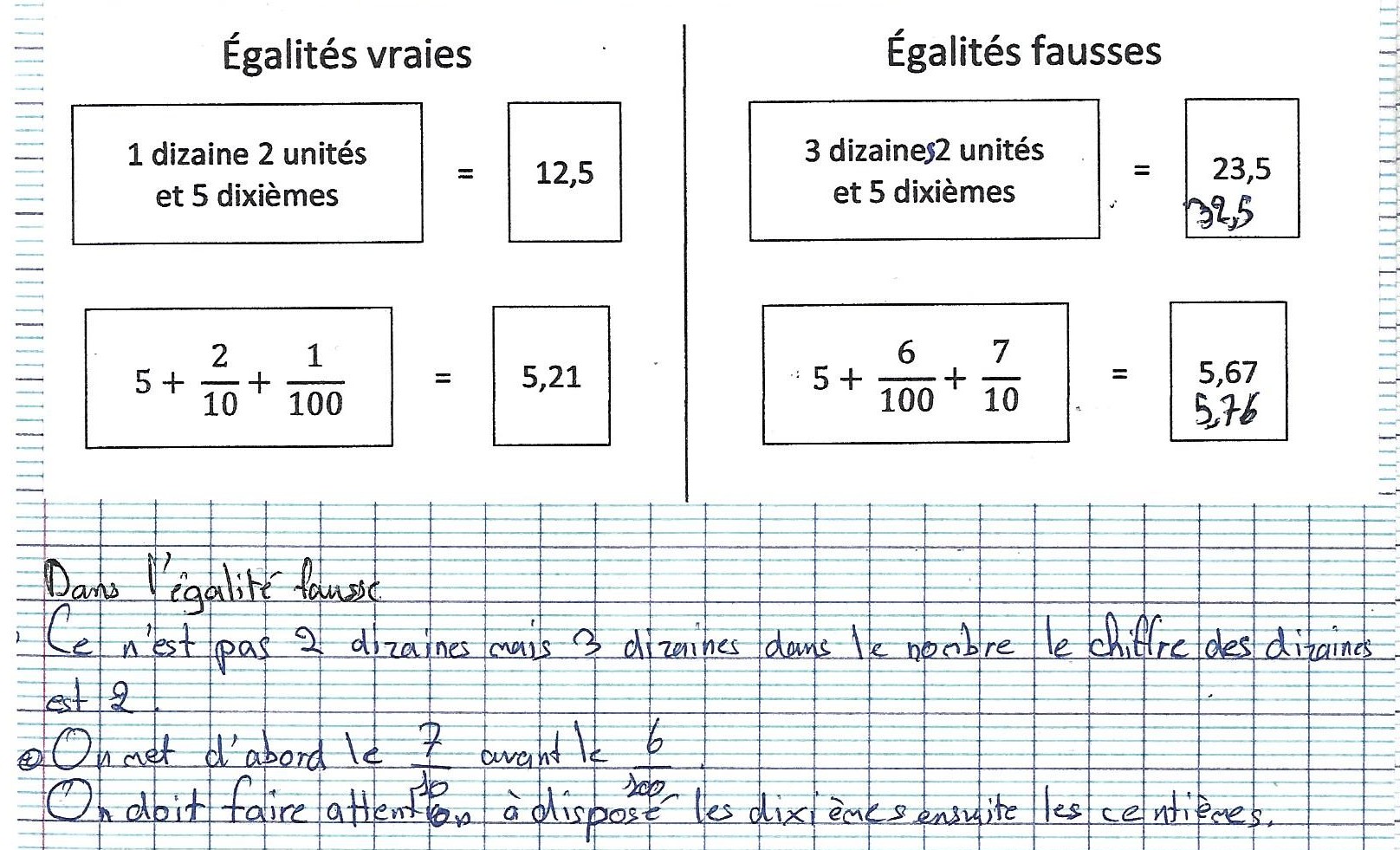> Elles concernent le rang : les chiffres des dixièmes et des centièmes sont mis en relation avec les fractions décimales correspondantes. (premère égalité fausse)