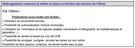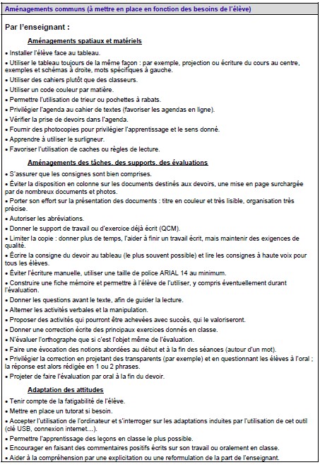 Voici quelques exemples d'adaptations : ces outils et aménagements pédagogiques doivent être personnalisés et correspondre aux besoins de l'élève, à ses capacités et à ses attentes. Il ne s'agit pas de les appliquer dans leur totalité. Ces actions peuvent également être profitables aux élèves en difficulté.