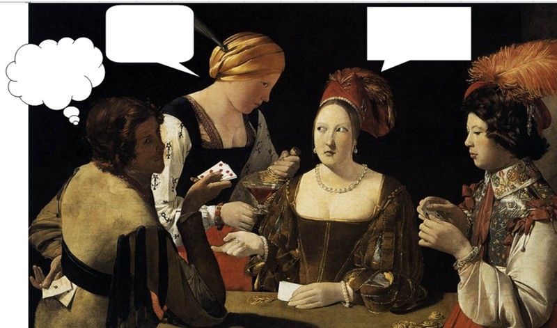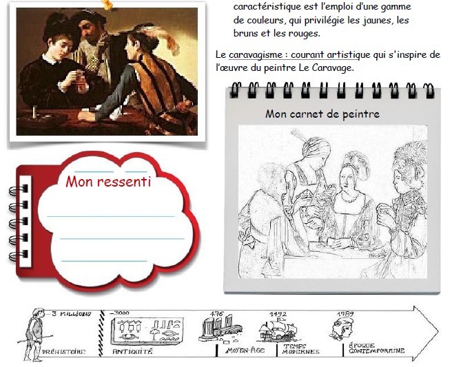 L’enseignant ôte les caches au fur et à mesure, de droite à gauche, pour permettre aux élèves de découvrir les choix de l’artiste et de comprendre la scène représentée: un jeu de regards : la femme assise jouant aux cartes regarde du coin de l'œil celle qui lui apporte le vin, qui elle-même observe un homme plongé dans l'ombre à gauche du tableau, qui, quant à lui, détourne son regard en direction du spectateur tout en se retournant légèrement. Ce mouvement permet de voir que cet homme sort discrètement un as de carreau dissimulé à l'arrière de sa ceinture, justifiant ainsi le titre de l'œuvre. Le regard est attiré vers ce personnage par le mouvement de main de la courtisane, qui le désigne. Seul le jeune homme à droite n'est pas entraîné dans le jeu des regards : les trois autres personnages ont donc une certaine complicité qu'il ne partage pas. ce jeune homme est entraîné dans le jeu par la courtisane, afin d'être alors dépouillé par le tricheur. De plus, le regard du joueur se porte vers le peintre et le spectateur, ce qui en fait les complices.