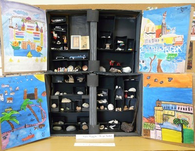 Etape 5 | Ateliers d'arts visuels![]() | Faire : développer le pouvoir d'expression des élèves. 3 étapes de création pouvant donner lieu à plusieurs séances d'arts visuels | Un cabinet de curiosités collectif Les élèves ont choisi le thème de la Nature qui est leur projet de classe : ils ont cherché des objets précieux de la nature (galets, fossiles, coquillages...) Etape 1. Chaque élève construit plusieurs boîtes avec le patron du cube et les peint en noir. Les boîtes servent à abriter les « merveilles » Etape 2. à partir d'œuvres ou de fragments d'œuvres, les élèves par 2, interprètent tout ou partie de cette œuvre pour peindre les vantaux intérieurs du futur cabinet de curiosité. Etape 3. installation du cabinet collectif : des grandes boîtes peintes en noir abritent les + petites où sont déposés les objets des élèves. Le cabinet de curiosités est exposé | Une création collective : savoir collaborer, s'appliquer, finir un projet | Matériel arts visuels, (peintures) boîtes carton patrons de cubes photocopiés reproductions de peintures de paysage |