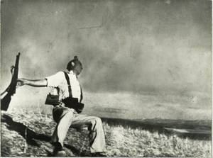 Robert Capa est le pseudonyme d'André Friedman, juif hongrois, né en 1913. Il quitte Berlin en 1933 pour fuir le nazisme et s'installe à Paris. Il photographie la guerre civile d'Espagne pour l'agence Alliance Photo, les magazines Vu et Regards. Il réalisera de grands reportages sur la seconde guerre mondiale de 1941 à 1945... En 1947, il crée Magnum, une agence indépendante, forte, fondée sur une éthique du métier de photo-reporter, sur une véritable ambition de photographie humaniste et engagée. Ils imposent leurs sujets de reportage, leurs images aux journaux et conservent les droits sur leurs œuvres en demeurant propriétaires des négatifs. Robert Capa mourra victime de l'explosion d'une mine, lors d'un reportage en Indochine, en 1954. Après la mort de Capa, les critiques mettent en cause, à juste de titre, l'authenticité de cette image.