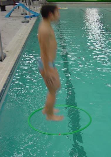 essayant de passer dans un cerceau à demi immergé. |