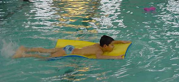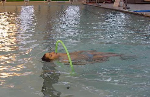 essayant de traverser le bassin, allongé sur un tapis, uniquement
