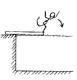position accroupie, au bord, en se laissant basculer dans l'eau en avant,