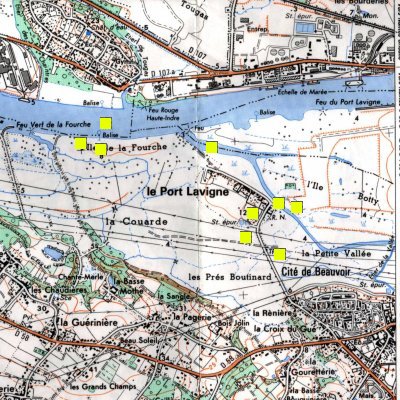 On this extract from the IGN map ( scale : 1/25,000 ), the main stopping places of the trip are indicated by yellow squares. Click on the squares to see pictures of the areas. You can also turn to the arial picture to spot the test sites.