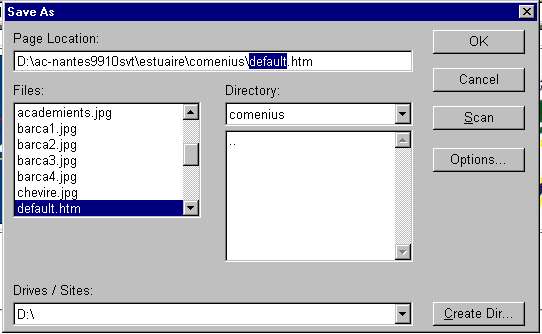| In the "save as" box, choose the good drive, the good folder (i.e. "directory"). You can see in the Page location line the complete path for your file. Type a name for your file. It must be ending with ".htm". Please use only small characters and numerals. Then click "OK" | ![]() |