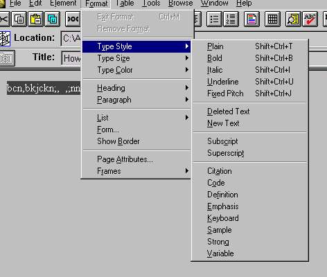 To change the text attributes select it and then use the "format" menu. You can change styles, colours and size but not the font because AOLpress is unable to do it. | ![]() |