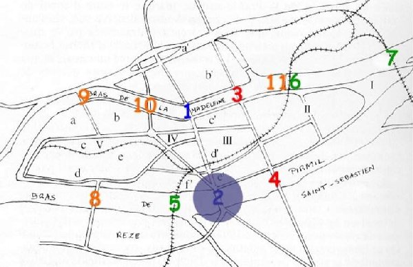 2 : le pont de Pirmil La deuxième ligne de ponts inaugurée le 17 septembre 1966 3 : le pont Aristide Briand 4 : le pont Georges Clémenceau Les ponts de chemin de fer : 5 : le pont de Pornic 6 : le pont Résal 7 : le pont de la Vendée