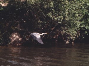 Son vol puissant est composé de battements d'ailes lents et amples, ses pattes dépassent alors la queue et sa tête est rentré dans les épaules. | ||||