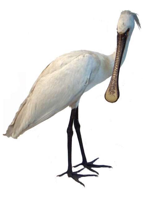 Description: Cet oiseau se distingue par son élégance, son plumage de couleur blanc pur qui présente en été une huppe, une marque jaune sur la poitrine ainsi qu'une tâche orange sur la gorge. Son bec long , noir et aplati, auquel il doit son nom, ébauche la forme d'une spatule. Son extrémité est colorée de jaune.