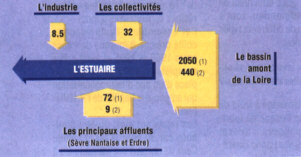 Le schéma qui suit montre les apports globaux de pollution dans l'estuaire, en tonnes de Demande Chimique en Oxygène par jour (DCO) - Extrait de "l'estuaire en question", magazine réalisé par la DRIRE, le SPPPI, et le ministère de l'environnement -