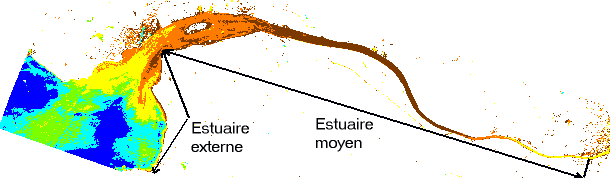 Traitement d'image satellitale montrant en brun, l'étendue du bouchon vaseux en juillet 1990