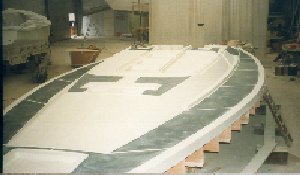 - Comme pour la coque , le pont requiert la réalisation d'un moule. Celui-ci est prêt pour la phase de production. La pose du gel-coat impose le nettoyage du moule avec un chiffon.