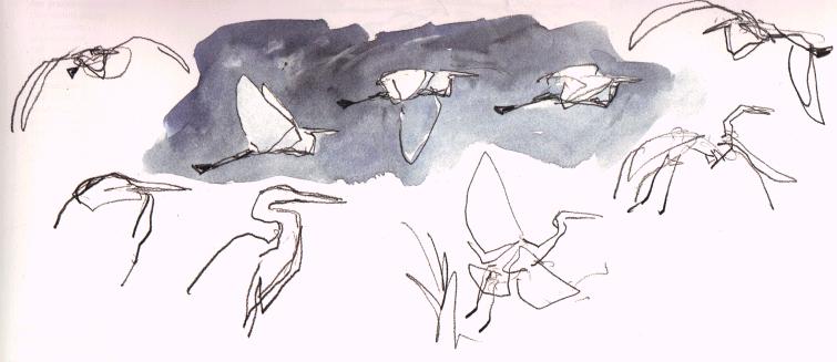 Grandes aigrettes en hivernage au Lac de Grand-Lieu. D. Clavreul, crayon et aquarelle. Illustration dans Pour une Loire vivante, Gallimard, 1996. D'une part, la première illustration frappe par sa sobriété, seuls comptent ici le mouvement et la vie, rien de figé, quelques coups de crayon traduisent la justesse de l'observation. C'est une étude, c'est-à-dire que l'artiste fait de nombreux croquis du sujet dans toutes les positions. Certains seront réexploités pour une représentation plus approfondie. Ici, le sujet sera repris dans une aquarelle plus colorée et plus détaillée (reproduite dans l'article d'Ouest-France du 04/10/1999) mais qui gardera l'idée de mouvement. |