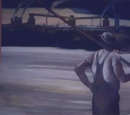Ce tableau, peint au Pellerin, met en scène un paysan, sa faux à la main, regardant par-delà le fleuve, la centrale de Cordemais |