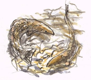 Deux saumons mâles. J. Chevalier ANF crayon
