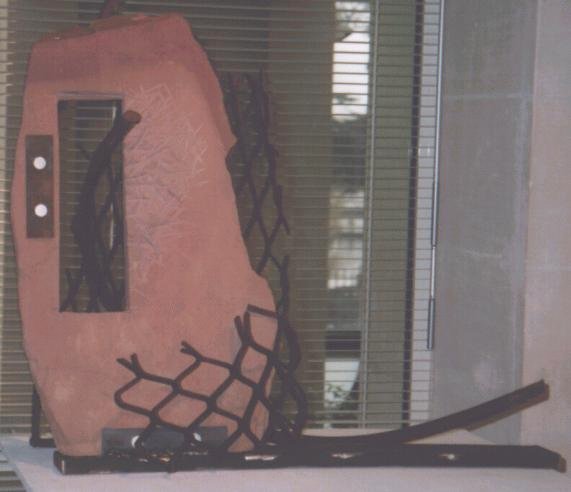 Franck MIEGEBELLE Transition, 1999 Métal, ardoise, les matérieux sont ceux de la région, une plaque d'ardoise brut rappelant les schistes du nord de la Loire et de la ferraille rouillée comme il en traîne aux abords des chantiers navals et du port. |