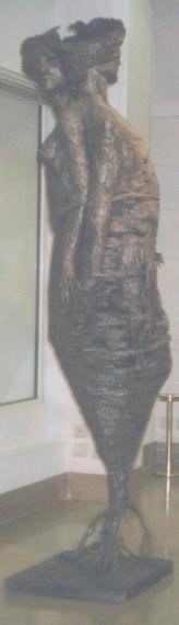 Serge SANGAN Universalité, 1997 Acier, soudure à l'arc. Prisonnier sur cette terre à la recherche de ses origines et de son destin. C'est une figure de proue, rappel maritime, avec une double face - féminine et masculine - le personnage est lié à la terre comme un arbre du bord du fleuve, rappel de la terre. |