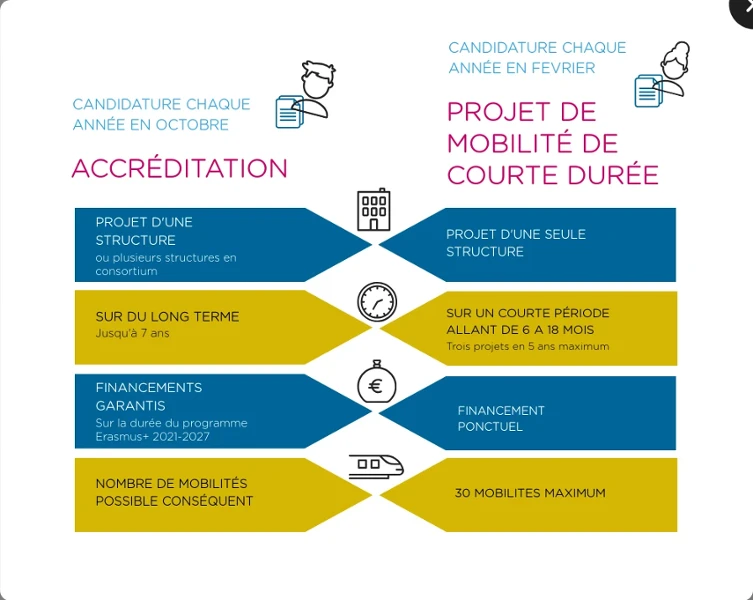Erasmus+ soutient les projets de mobilité de courte durée et les projets sur le long terme qui nécessitent une accréditation :
