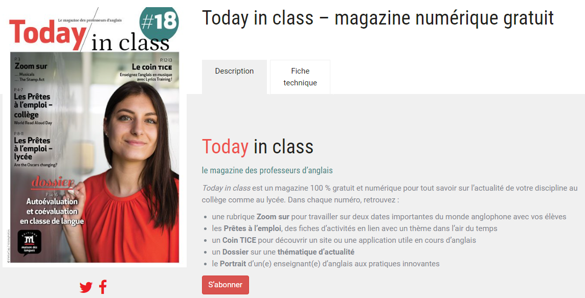 Vous trouverez dans cette ressource un lien vers la page d'accueil du site Today in class, le magazine en ligne des professuers d'anglais. dans chaque numéro, vous trouverez: