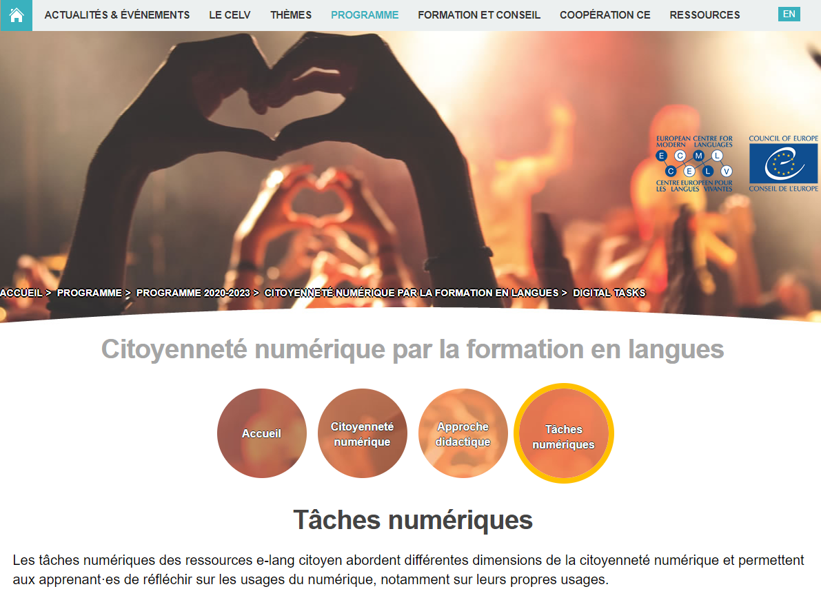 En cliquant sur l'image vous trouverez des tâches numériques proposées par le Conseil Européen pour les Langues Vivantes (CELV). Grâce à ces tâches vous amènerez les apprenants à réfléchir sur leur usage du numérique et sur la notion de citoyenneté numérique.