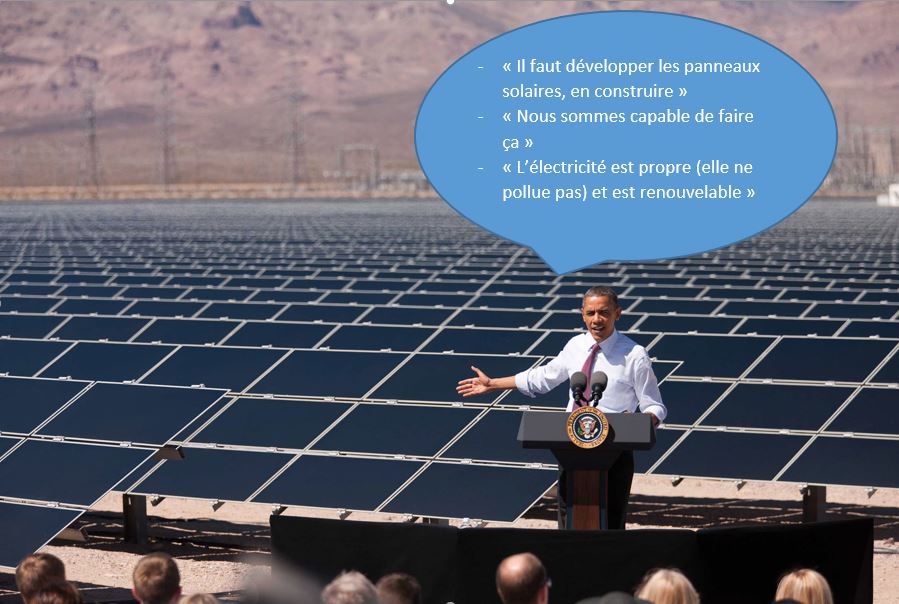 A partir d’une simple photographie projetée montrant le président Obama faire un discours devant le parc solaire Boulder solar de Las Vegas, quelques élèves créent au tableau une bulle de dialogue et imaginent un discours politique basé sur l’utilisation d’énergie propre et renouvelable.