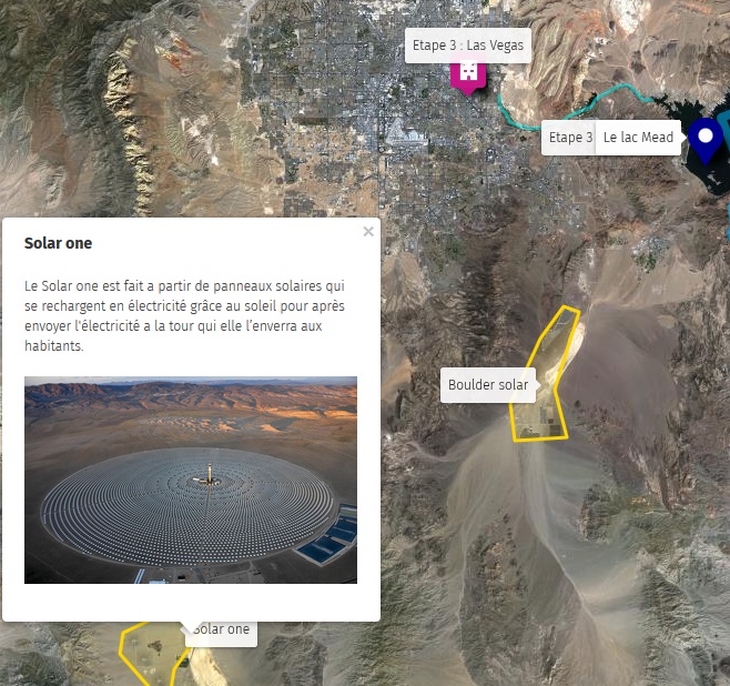 Faisant suite à une étude régionale du Colorado qui a permis la création d'une carte numérique augmentée, les élèves zooment sur la situation de Las Vegas et y intègrent plus en avant la question énergétique. Le principal aménagement à proximité de la ville, le Hoover Dam et son lac Mead, est déjà connu des élèves.