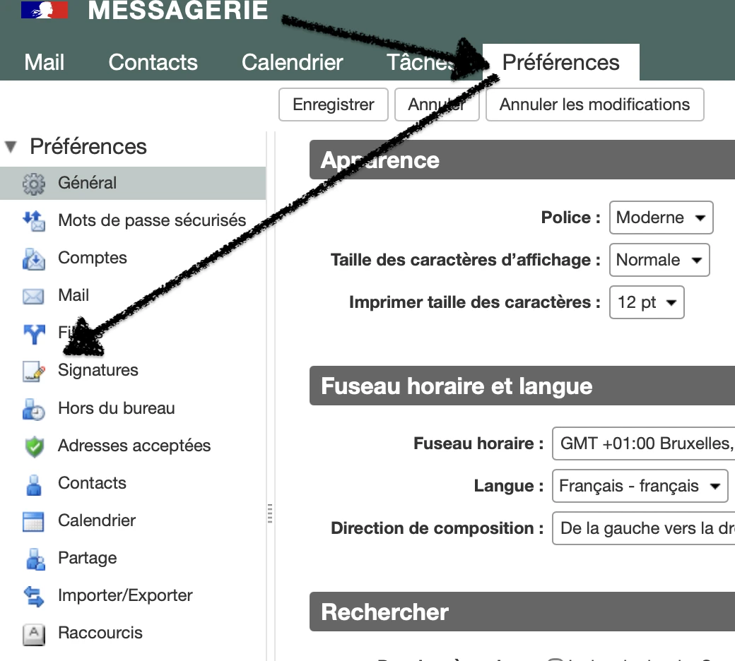 Depuis la page d'accueil de la messagerie aller dans l’onglet « Préférence”, puis signature.