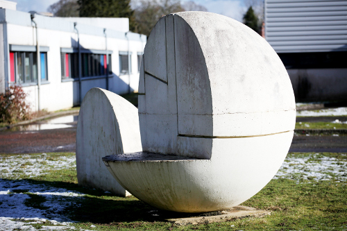 À Mamers, il conçoit un ensemble architectural en préfabrication modulaire métallique coloré et trouve un point d'équilibre entre ses idéaux pédagogiques et les contraintes budgétaires. La terre décaissée du chantier ne sera pas évacuée par économie et employée pour dessiner les reliefs du paysage extérieur. Cette information nous permet d'élargir le périmètre de l'œuvre de Michèle Goalard et d'appréhender également l'espace valonné où trouvent place et se figent « les boules » !
