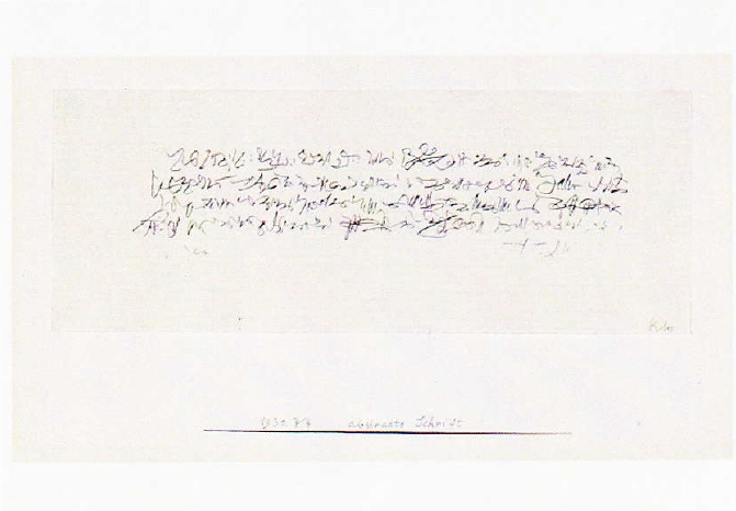 Effectivement, la ligne sépare l'espace blanc en deux parties, elle permet d'être en fonction de sa forme et de son agencement élément « squelettique » du constituant de chaque lettre. Mais elle évoque aussi un ensemble de mots qui assemblés constituent une ligne. Dès lors on saisit que la frontière entre le scriptural et le graphique est plus perméable qu'on aurait pu l'imaginer, et à la surface des souvenirs remonte la phrase « point à la ligne »qui scandait nos dictées d'écolier. Dans le même registre on pourrait considérer le point comme élément nodal du langage graphique. Si l'on pousse la comparaison en allant jusqu'au texte, on peut constater que le mot texte vient vient du latin textus qui signifiait tissage. Cette remarque nous permet d'envisager ainsi plastiquement l'écriture : sur une trame, les mots viennent s'inscrire dans A heap of language avec un point de départ qui serait en haut de la pyramide. L'artiste tisse du sens avec les mots en faisant image. Dans l’œuvre de Paul Klee Abstrakte schrifft , l'écriture se fait presque musicale, elle implique une certaine horizontalité dans son déploiement dans l'espace de la feuille et a par cette organisation spatiale à voir avec l'écriture. Cette trame qui tient les mots va se faire structure métallique pour porter les mots qui occupent l'espace du Palais de Tokyo dans Sans titre, 1985, de Richard Baquié et dont les lettres sont découpées dans des plaques d’imprimerie offset.