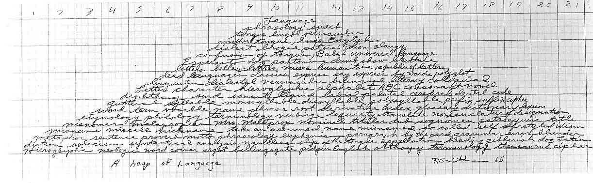 La citation de Robert Smithson dans l'ouvrage de Simon Morley est en lien avec l'œuvre A heap of langage . Il nous invite à ne pas lire, mais à regarder. Alors que voit-on ? Sur une trame composée de vingt et une colonnes et cinq grandes lignes, l'orthogonalité se redivise dans chaque cellule. Sur cette trame apparaît un ensemble écrit qui fait image et représente un tas de langage. Cette masse graphique s'organise autour d'un axe central vertical en haut duquel on peut lire le mot language . Ce mot, mis au sommet de cette forme, émerge plus facilement de la masse car il est seul. Pour le reste, on s'approche et l'on peut s'apercevoir que les mots ont un rapport avec le langage, on peut aussi lire le mot esperanto entre autres. Ainsi, si l'artiste nous invite à considérer le mot comme signe plastique, comme ensemble constitué de multiples particules, il ne vide cependant pas les mots de leur contenu signifiant car ils sont comme une tautologie : les mots en tas pour parler du langage. Robert Smithson nous demande d'ajuster notre regard pour le vider, pour oublier la lisibilité qui laissera place à une certaine visibilité. Ici, l'ensemble des mots fait image : on peut alors penser à Apollinaire qui en 1914 écrit un calligramme dont le titre est Il pleut. Les lettres tombent dans la page pour évoquer la tristesse et font l'image de la pluie. Dès lors on saisit la portée de ce que propose Guillaume Apollinaire quand il affirme : « il faut que l'on s'habitue à penser synthético idéographiquement et non plus analytico discursivement ». Ainsi le discours est mis de côté dans un premier temps pour saisir l'ensemble en un coup d’œil.