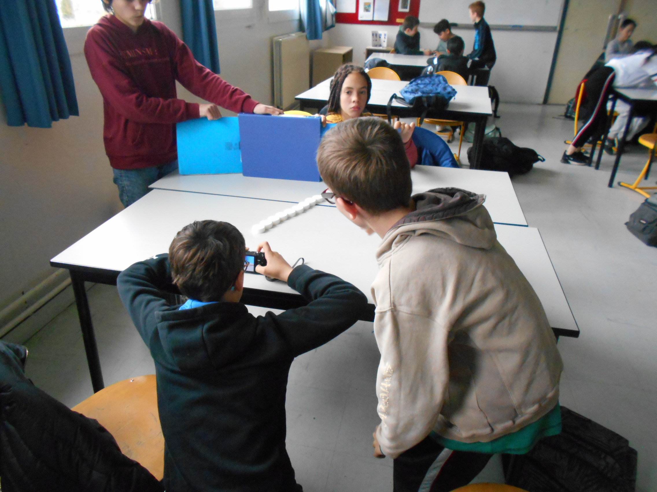 Le dispositif du cours se déroule dans le noir mais éclairé avec des lampes de poche. L’éclairage entraîne des déformations, des agrandissement, des nuances de gris que les élèves découvrent. Le croisement des éclairages fait apparaître des dédoublements amusants. Les élèves ont pour consigne de réaliser une photographie qui permettra de garder en mémoire cette expérimentation. Si certains îlots décident de réaliser plusieurs photographies, ils devront se mettre d’accord pour n’en présenter qu’une et devront expliquer leur choix.