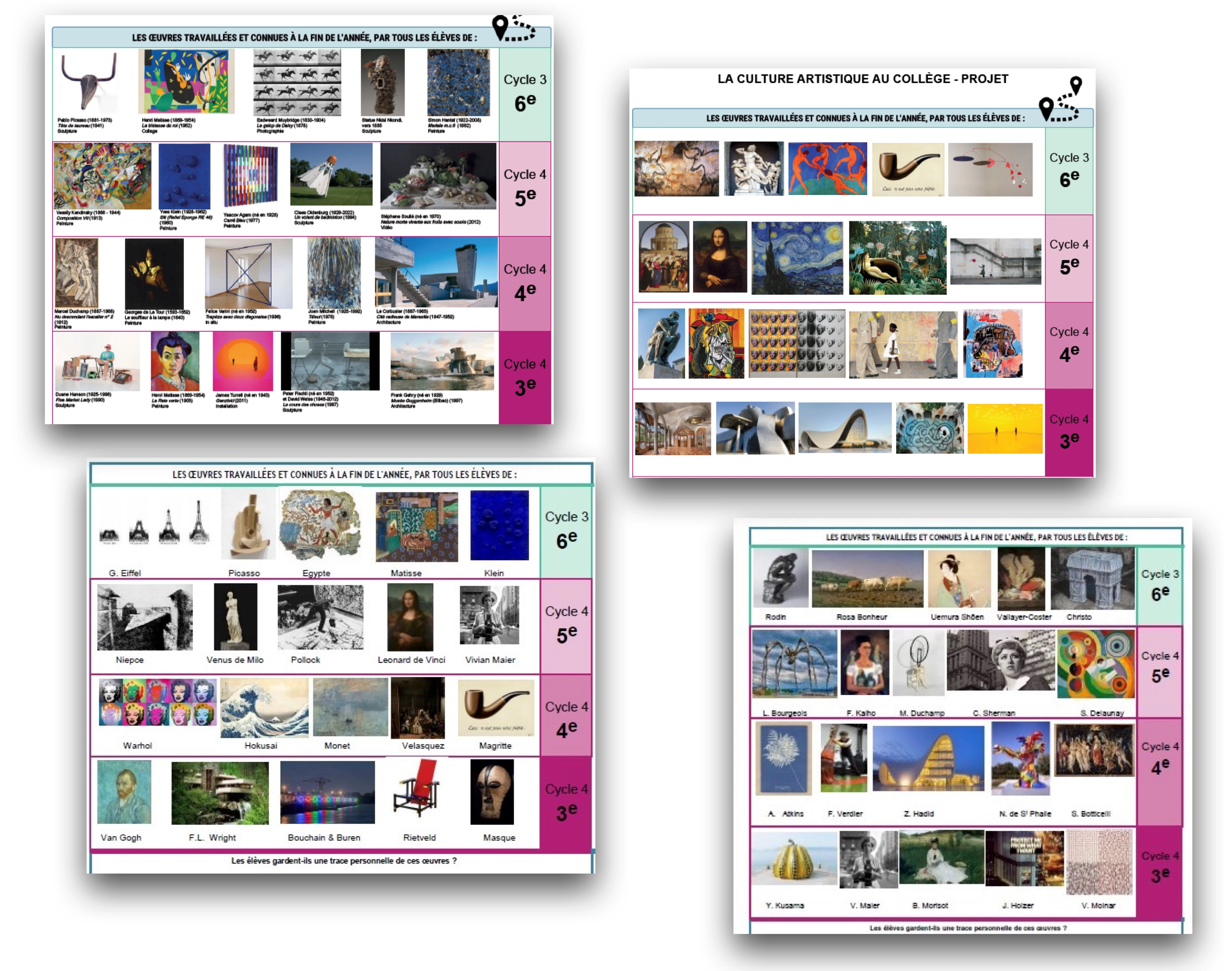 La "fiche projet" permet à chaque équipe de formaliser le parcours d'histoire des arts en termes de culture artistique. En écho aux objectifs partagés, les reproductions d’œuvres qui attestent d’un regard permanent de la part des élèves, sont affichées sur les murs de la salle commune.