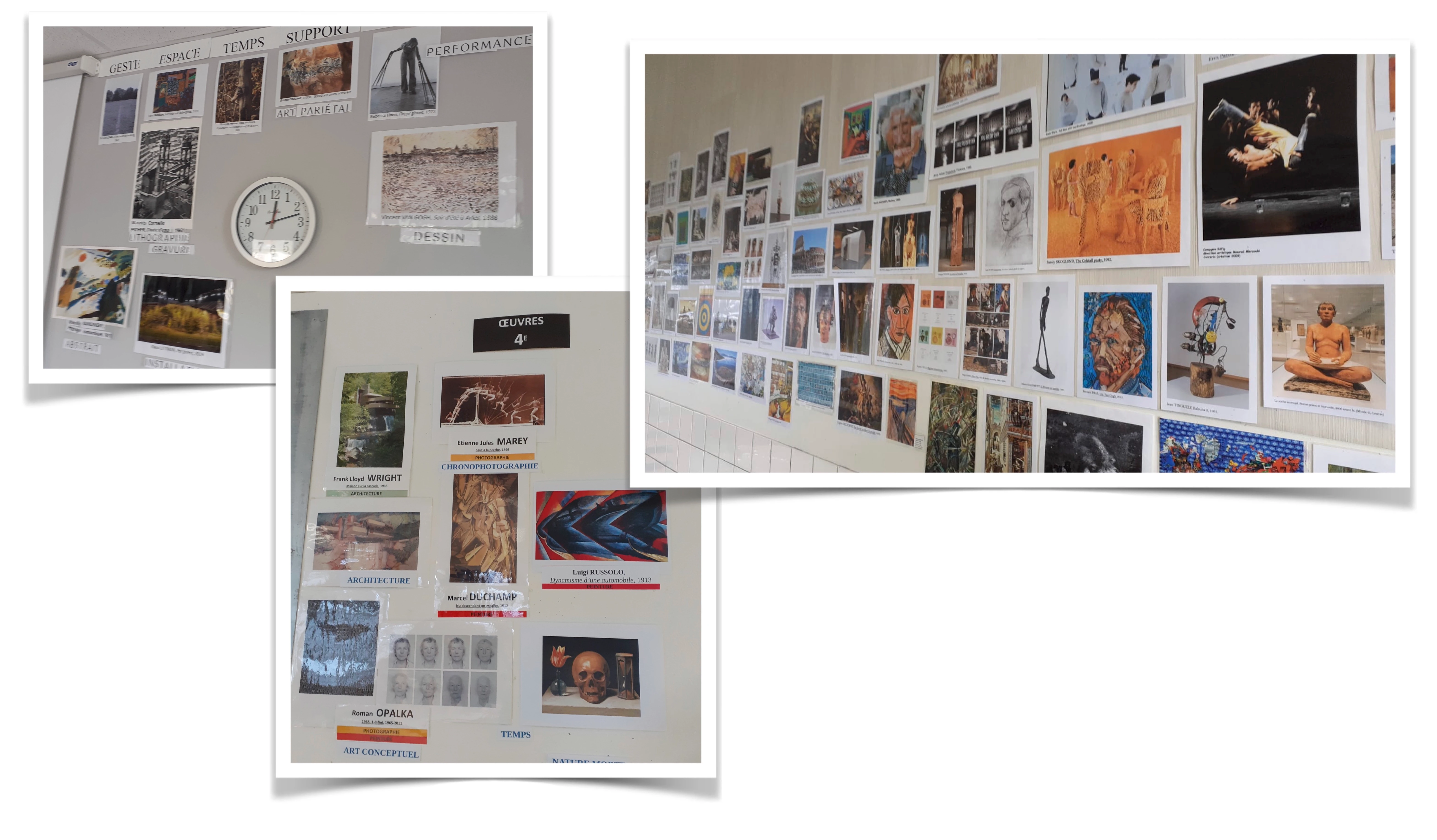 Un parcours d'histoire des arts entre en écho avec leur présentation au mur de la salle, dans un espace dédié dans la salle d'arts plastiques mais aussi à l'extérieur, dans la salle de cours d'une autre discipline ( histoire, français...), au CDI, dans la salle des professeurs...
