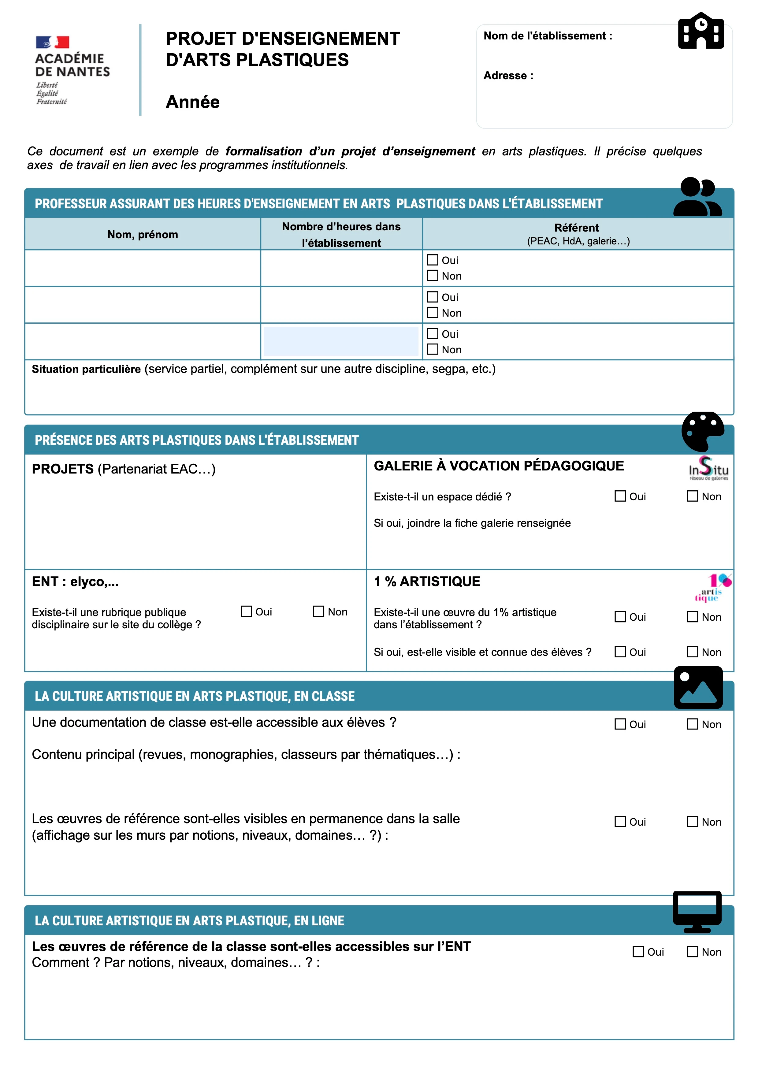 A télécharger en bas de cette page, la fiche projet est un recto-verso à renseigner en début d'année, seul-e ou en équipe, afin d'établir des axes de culture générale et artistique, de proposer aux élèves des repères à partir d'oeuvres significatives de l'Histoire de l'art, des connaissances visées en priorité au cours de la scolarité des élèves.