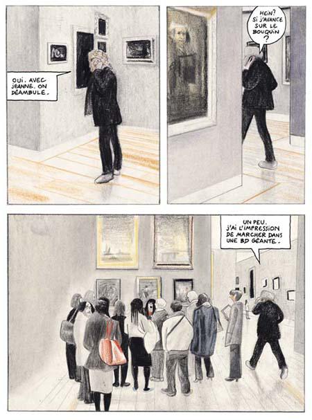 Un groupe d’élèves involontairement agglutinés dans la même position que les naufragés du Radeau de la Méduse ; un homme derrière le Scribe Accroupi, comme s’il tentait de lire par dessus son épaule ; dans les salles des antiquités grecques, étrusques et romaines, une jeune femme, qui place sa tête dans la gueule d’un lion… Le dessinateur est le spectateur et le témoin de cet étrange va et vient, où l’œuvre s’efface pour donner toute sa place au regard et au spectateur.