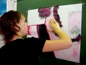 Morgane est restée assise à sa table, à la fin elle s'est rendue compte que son travail n'occupait pas la feuille et qu'il était "de travers". En lui montrant comment elle avait travaillé elle comprit de suite qu'elle masquait une partie de son support et que de ce fait elle ne l'avait pas utilisé.