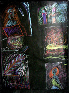 Mahéry, première réalisation, gouaches, fusain, pastels gras