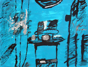 Marina, gouache, pinceaux, rouleaux, doigt.